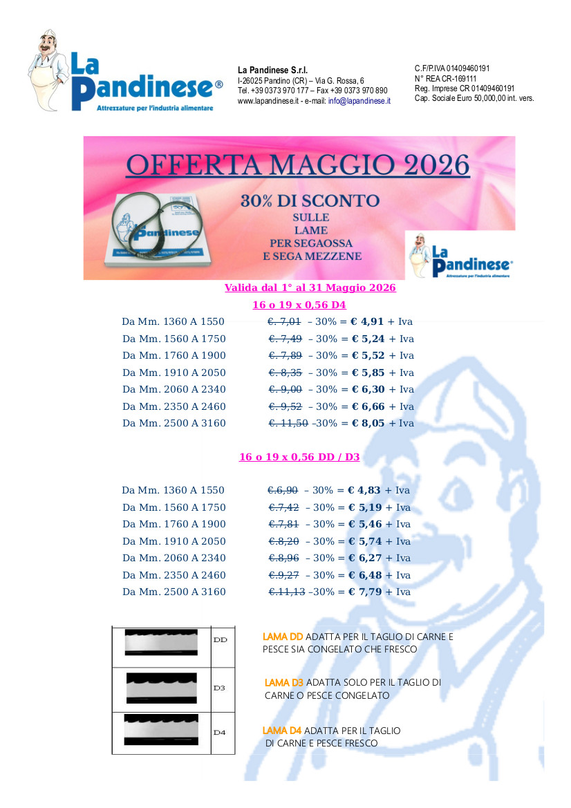 La Pandinese Srl è un’azienda italiana che da oltre 40 anni si occupa della produzione e commercializzazione di lame e coltelleria per l’industria alimentare, ottimizzate per l’uso in macellerie, salumifici, pescherie, caseifici e reparti specifici della grande distribuzione, fino all’uso nella grande industria. Lame di elevata qualità interamente realizzate in acciaio inox inossidabile che corrispondono ai canoni internazionali sulla qualità delle lame, la produzione prevede che la saldatura avvenga nel rispetto di tutte le norme sulla sicurezza per assicurare massima qualità ed economicità.